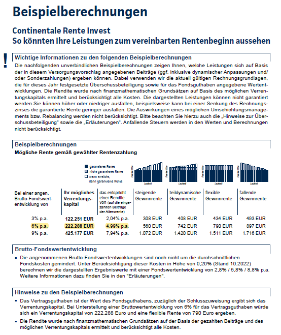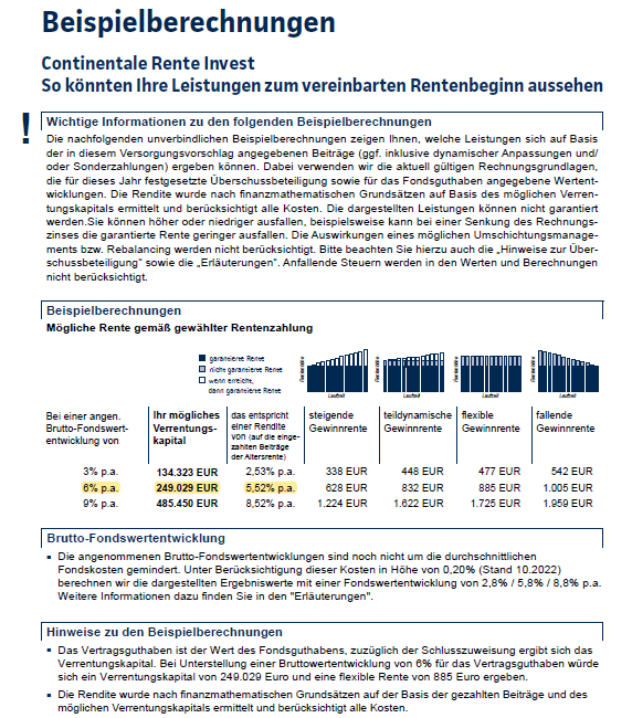 Hinweis: Diese Ausschnitte sind aus dem Angebotsvorschlag des Produktanbieters Continentale Lebensversicherung a.G. , Rente Invest Tarif RI vs. RI – A0B0) A0 = Abschlussprovision 0 € und B0 =Bestandsprovision 0 €. Die Vertragsbewertung entspricht geplanten Beitragsumme 200 € x 12 Monate x 35 Jahre. Eine Anbieter und Produktempfehlung sprechen wir damit nicht automatisch aus. Relevant für die Beratungsprotokollierung.